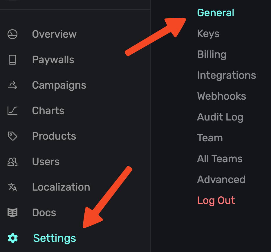 Then, head to the Superwall Dashboard. Click on Settings from the Dashboard panel on the left, then select General: