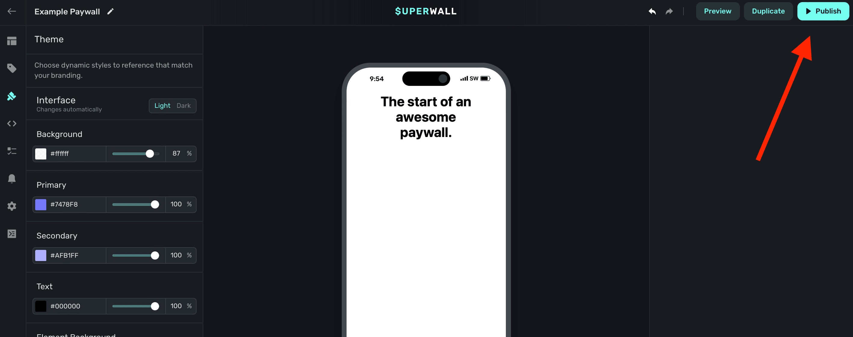 To set your paywall live, click the Publish button in the top-right side of the editor: