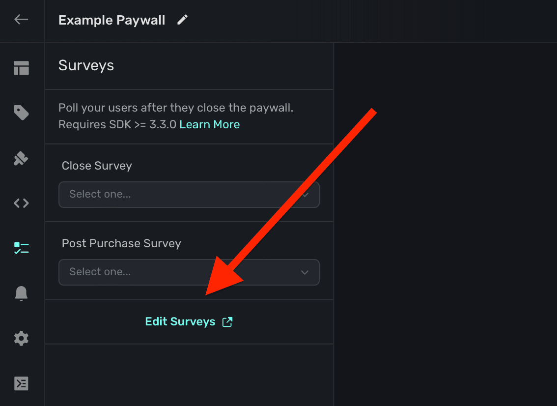 To set up a survey to show users when they close a paywall or perform a purchase, click the Surveys button from the sidebar: