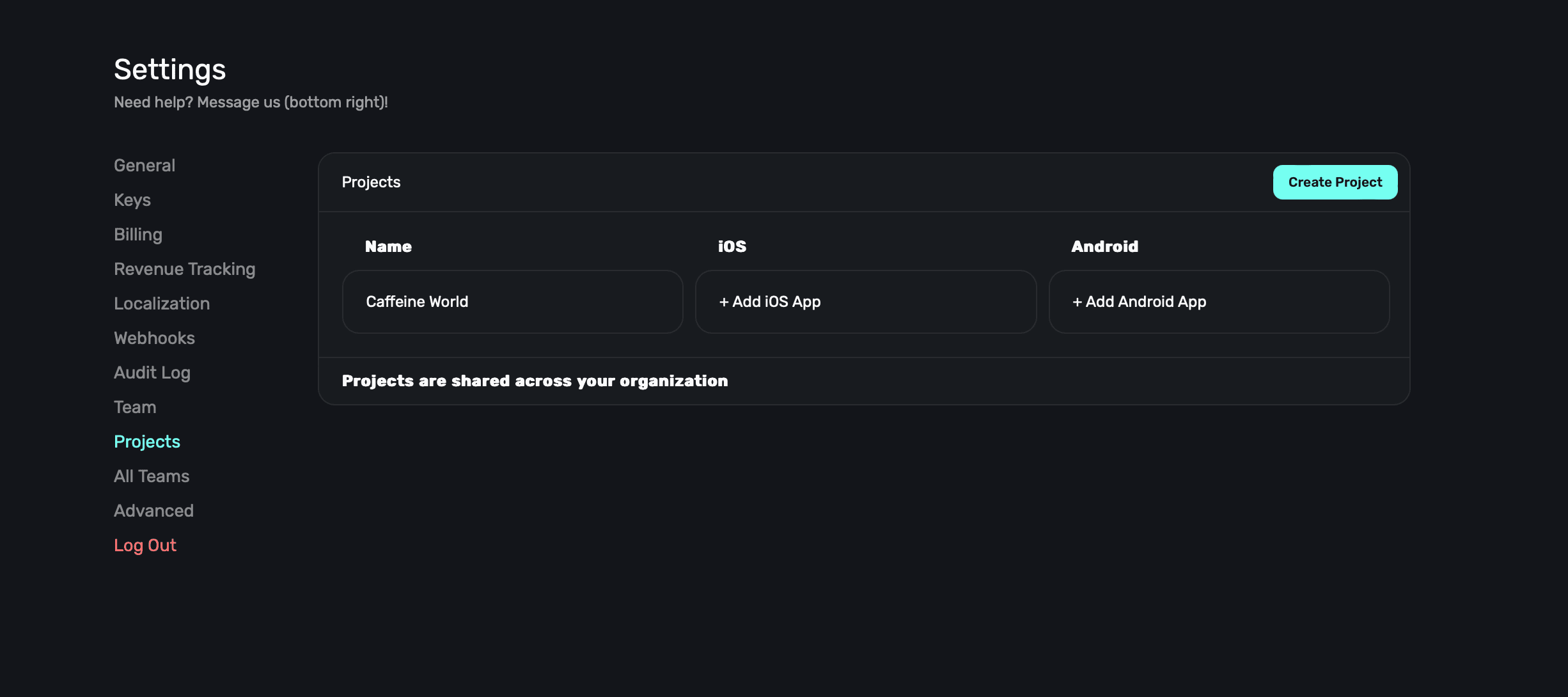 To create a new project, click the Create Project button at the top right:
