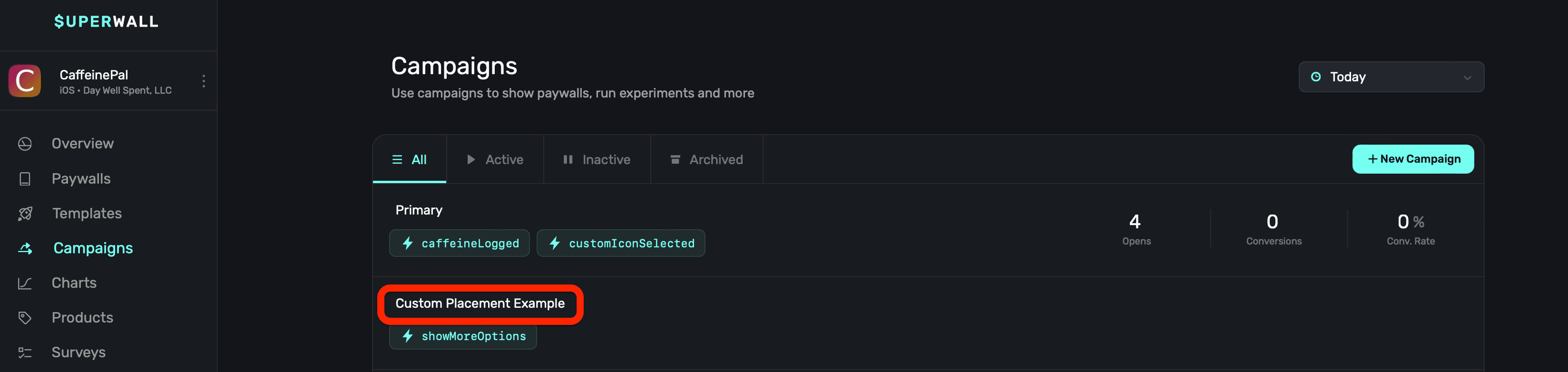 Create a new campaign specifically for this purpose, here — it's called "Custom Placement Example":