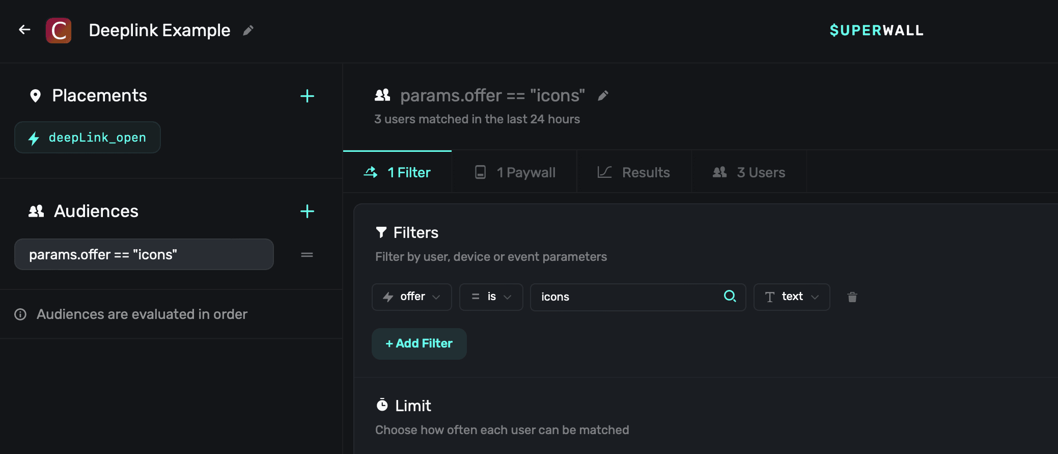 They both have the same idea, though. You create a new campaign specifically for this purpose, attach a paywall and either add a filter (for deep linking) or a new placement (for custom placements) to match users to it.