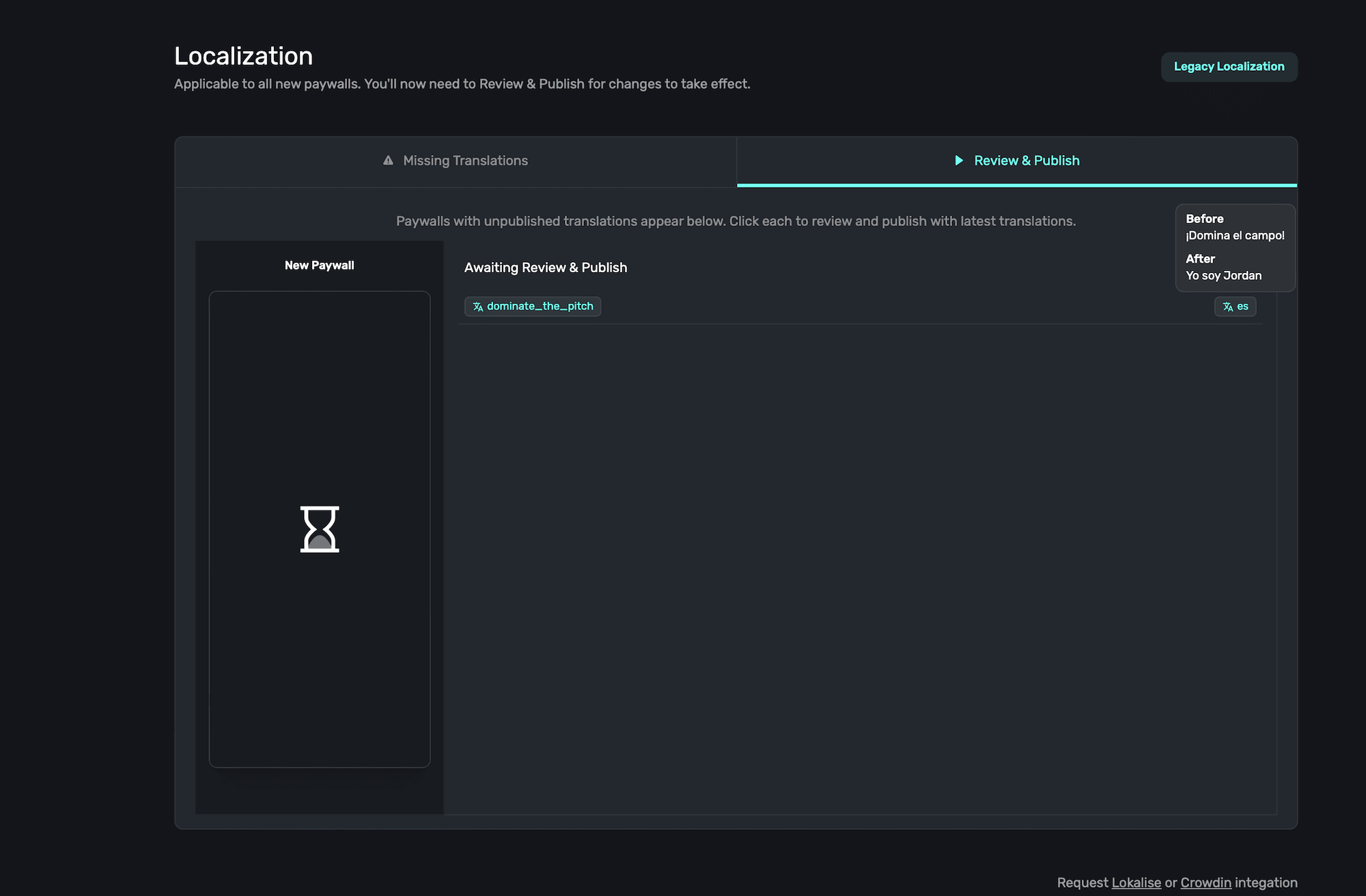 - Review & Publish: Any localizations that have changed which are used on multiple paywalls (or changed from an external localization provider) show up here. Paywalls using any edited localization key here will continue to use the "old" value it had before it was changed, and you can publish the updates live for the other paywalls after reviewing them.