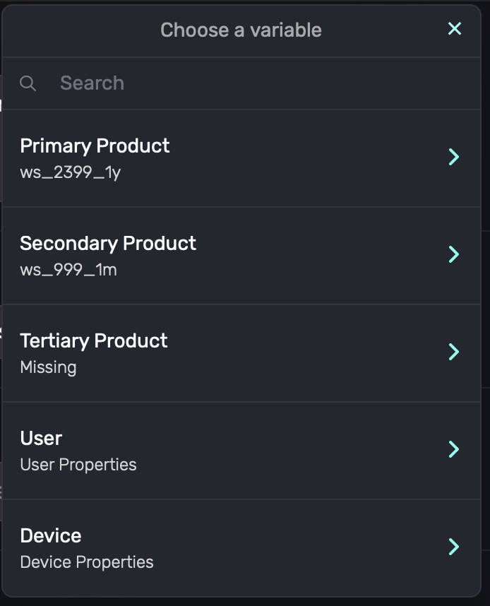 You can show product, user, or device data within text elements by adding a Variable. This uses a language called Liquid to substitute in data at runtime.